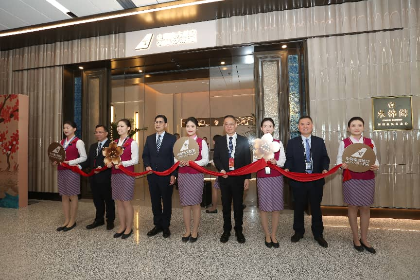 Attending officials take part in a ribbon-cutting ceremony to mark the opening of China Southern Airlines’ VIP lounge in Terminal 5. [Photo provided to chinadaily.com.cn]