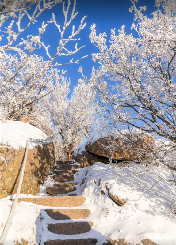 This winter wonderland presents breathtaking landscapes where the sea meets the misty mountains. [Photo by Pang Shaojiang/WeChat account: laoshan96616]