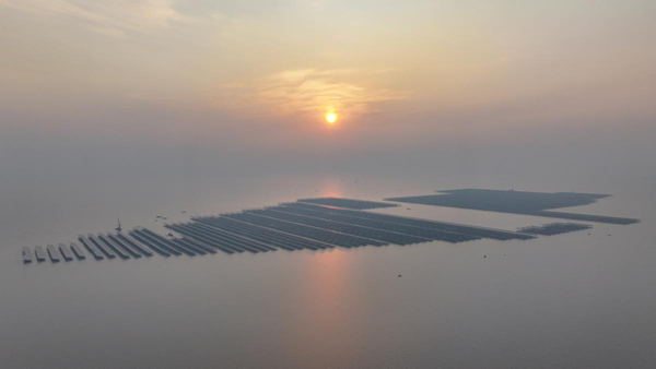 The 1,000 MW offshore PV project in Kenli district of Dongying, Shandong province, connects to the grid on Friday. [Photo by Zhou Guangxue/for chinadaily.com.cn]