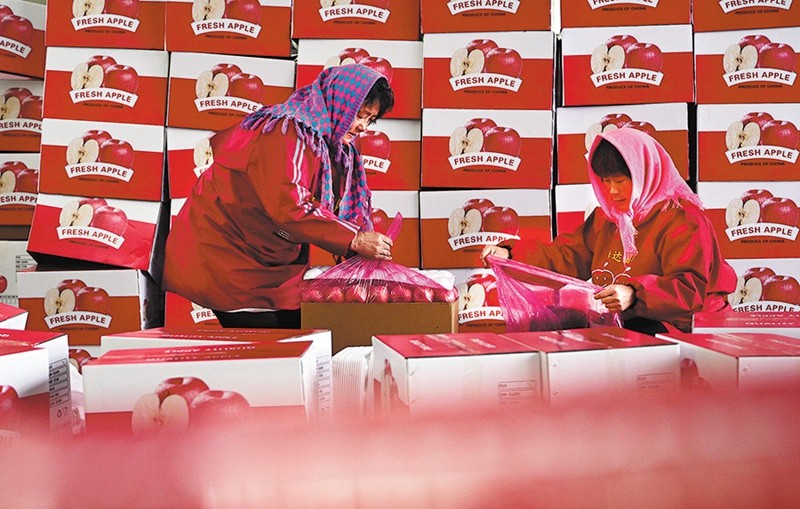 Workers at a fruit trading company pack apples in Zhongzhuang township, Zibo city, Shandong province, on Dec 19. [Photo provided by Zhao Dongshan/You Kuikui/For China Daily]
