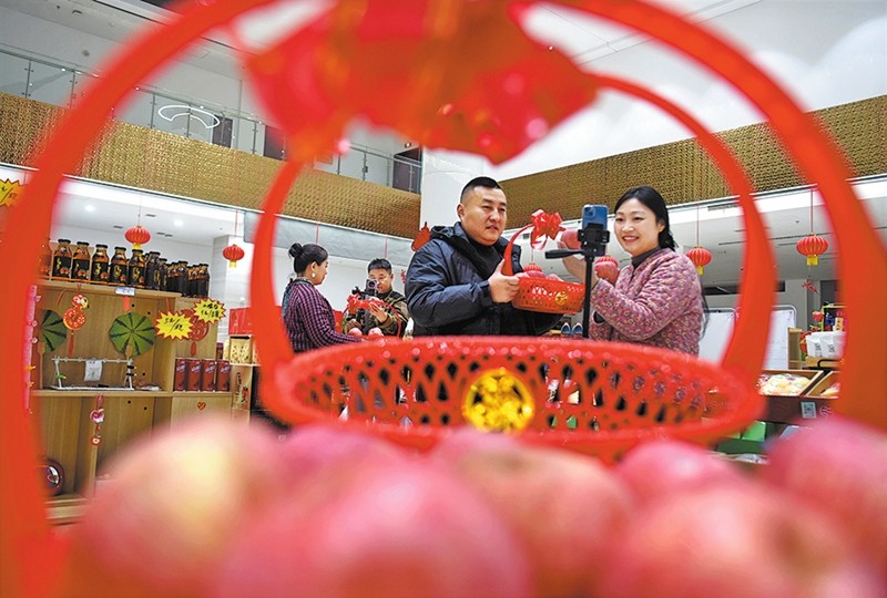 Two couples promote apples through livestreaming from a specialty store in Zhongzhuang service area along the Linzi-Linyi expressway in Zhongzhuang township, Zibo city, Shandong province, on Nov 9. [Photo provided by Zhao Dongshan/You Kuikui/For China Daily]