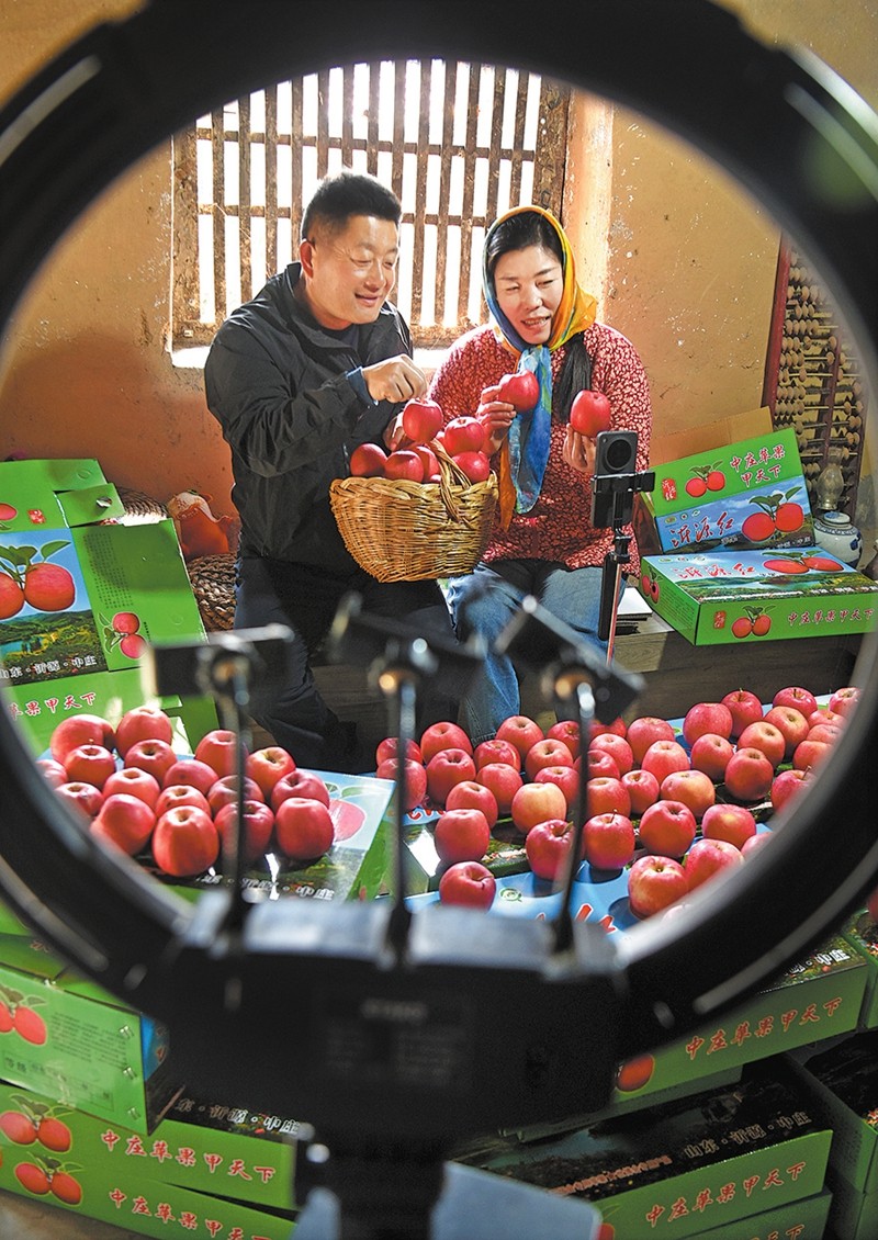 A husband-and-wife team sells apples from their home studio in Zhongzhuang township, Zibo city, Shandong province, on Nov 6. [Photo provided by Zhao Dongshan/You Kuikui/For China Daily]