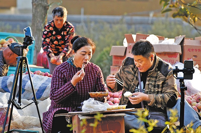 A husband-and-wife team takes a meal break during a livestreaming session in an orchard in Zhongzhuang township, Zibo city, Shandong province, on Nov 9. [Photo provided by Zhao Dongshan/You Kuikui/For China Daily]