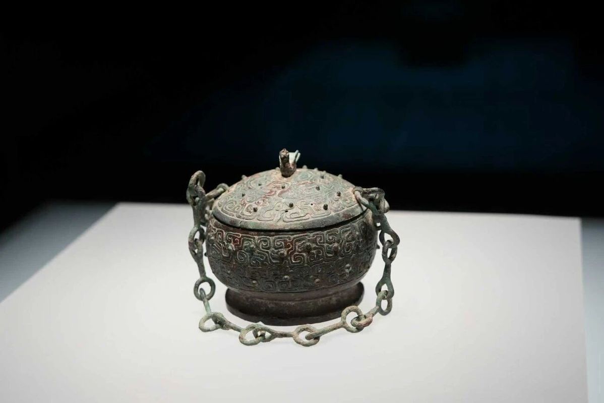 About the size of an apple, this exquisite bronze box once held cosmetics or ornaments used by Zhou Dynasty (c.11th century-256 BC) elites. Its rounded body is decorated with panhui (coiled snake) motifs, dotted with rivet patterns.