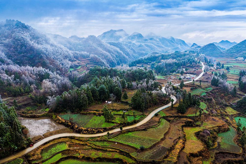 An aerial view of the terraced fields in Qianxi, Guizhou province, cloaked in white rime. [Photo by Wu Chuanjuan/For chinadaily.com.cn]