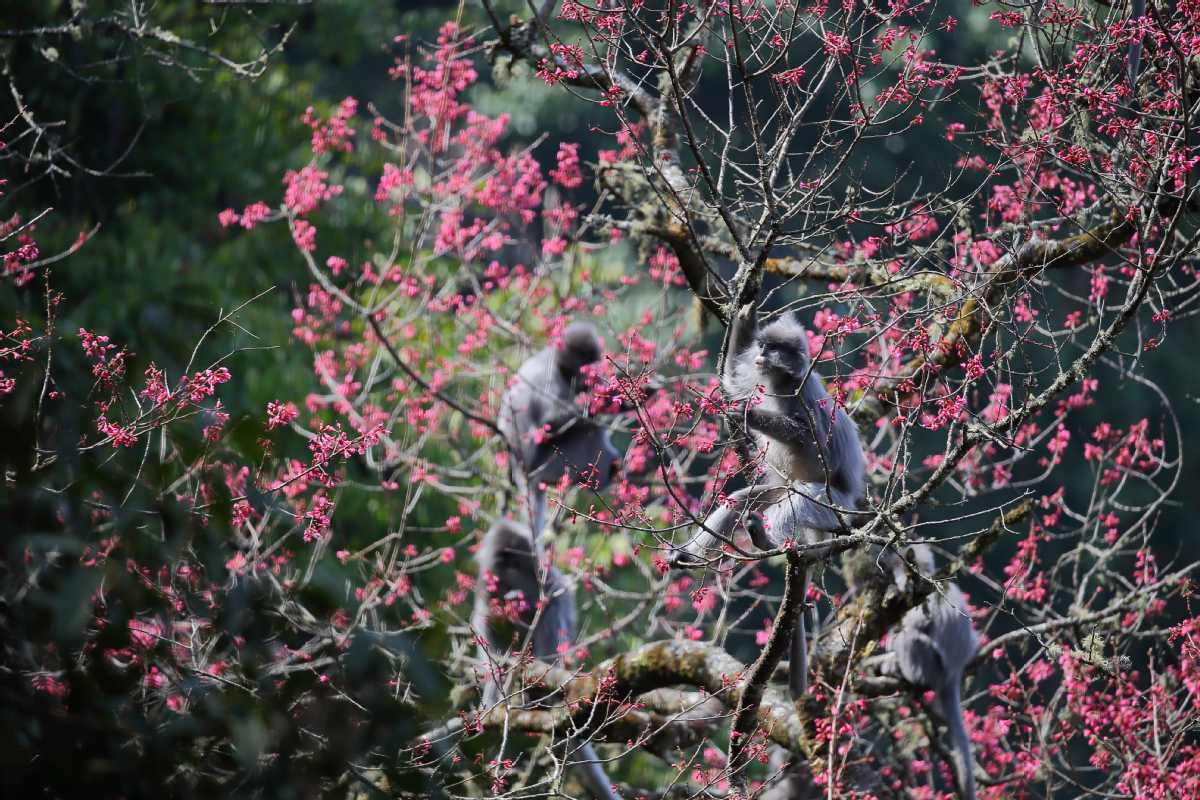 A photo shows Indochinese gray langurs feasting on the winter cherry blossoms in Wuliang Mountain National Nature Reserve, Yunnan province. [Photo by Jingdong County Integrated Media Center / for chinadaily.com.cn]