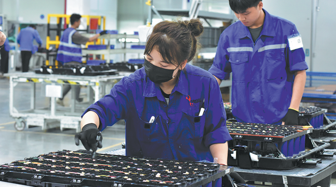 Workers engage in the production of NEV batteries at a new energy technology company in Liuzhou, Guangxi Zhuang autonomous region, on Sept 8. LIAO ZUPING/FOR CHINA DAILY