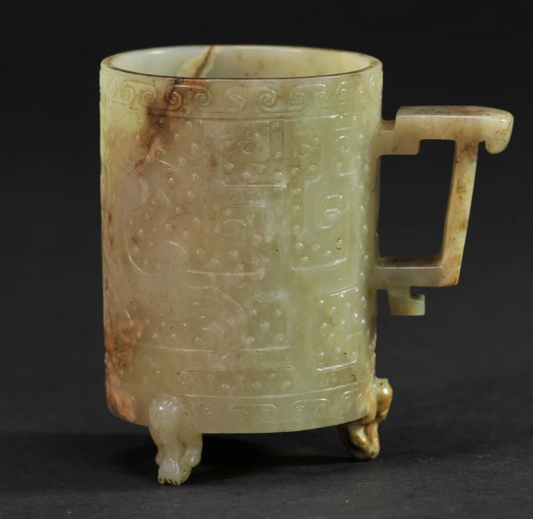 Carved from greenish-white jade with a yellow tint, this cylindrical vessel features a single handle adorned with dragon and phoenix motifs, a deep interior, a flat base, and three beast-shaped feet. Imagine pouring hot wine into it on a freezing day – one small sip to chase away the cold. Collection: Wuhan Museum in Hubei province.