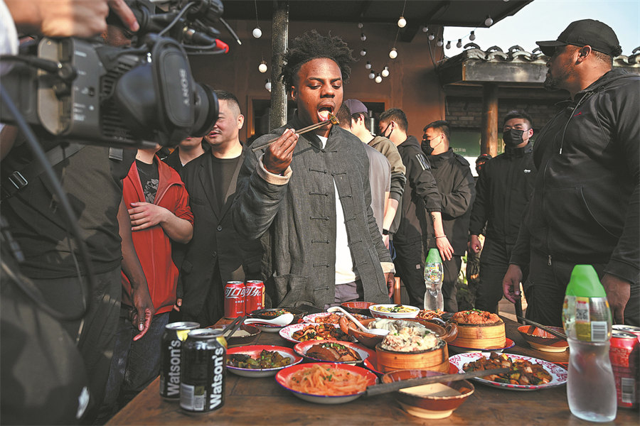 American internet celebrity Darren Watkins Jr, better known as iShowSpeed, tries local delicacies in Chongqing on April 3, 2025, during a trip exploring the wonders of the municipality. [Photo/China News Service]
