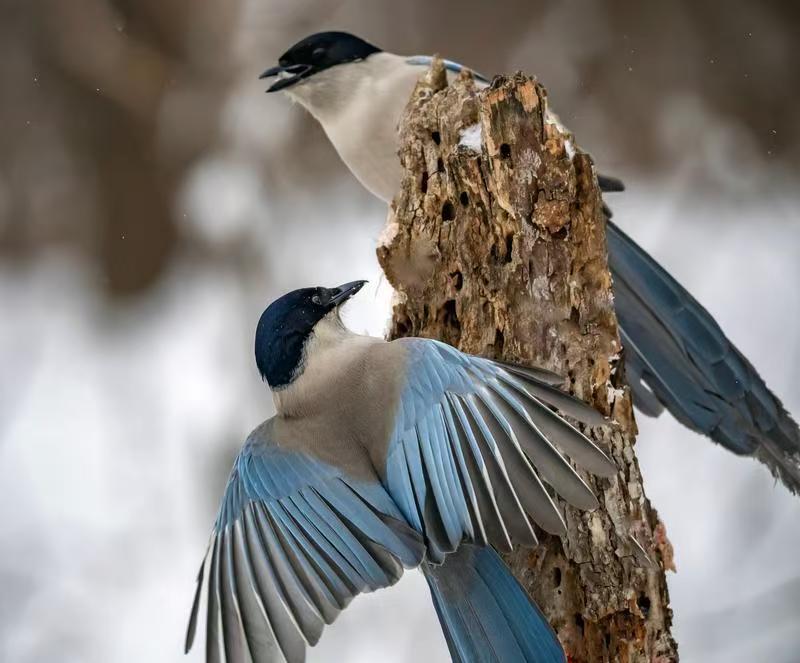 Gray magpies perch on a tree stump in Qianpailou village in Panshi city, Jilin province. [Photo by Jinlin Daily/For chinadaily.com.cn]