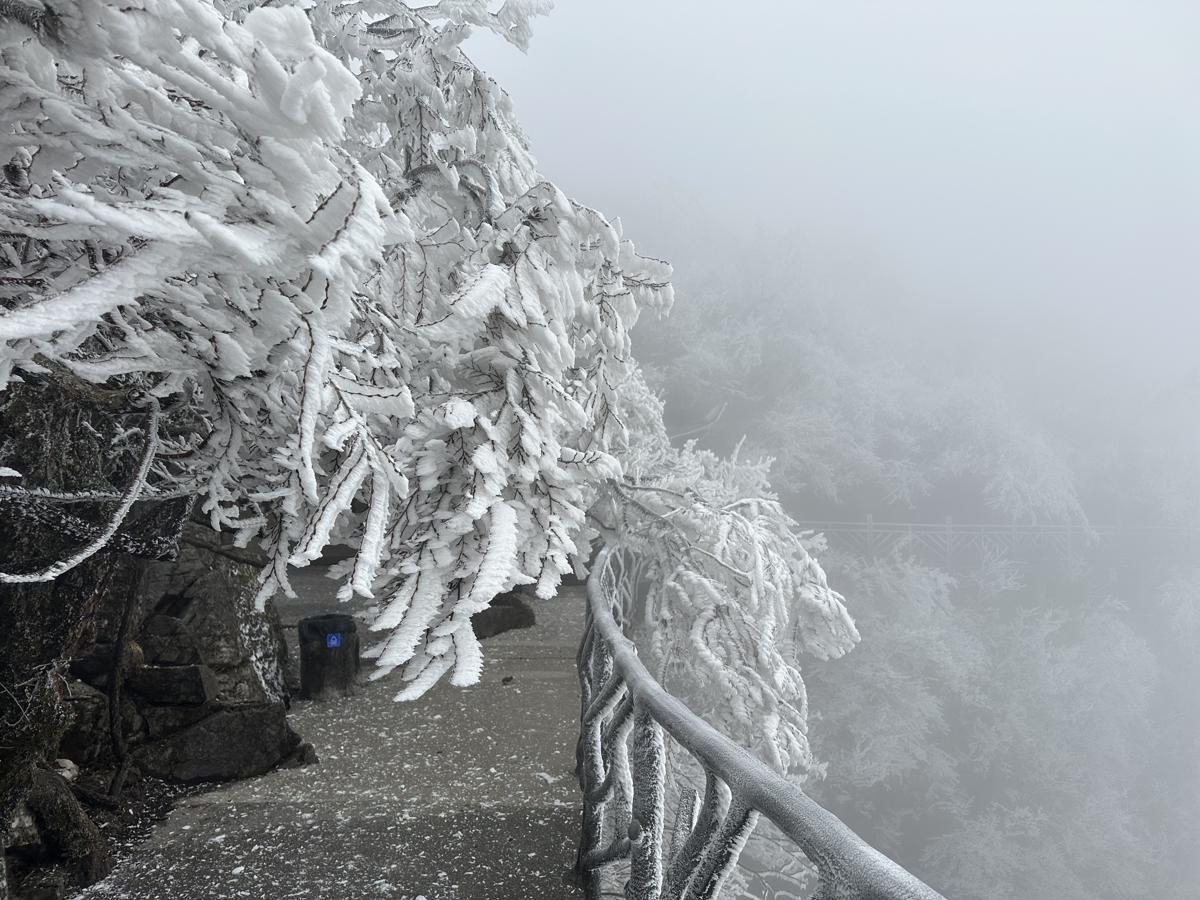 A powerful cold front sweeping through Central China dramatically transformed the landscape of Tianmen Mountain in Zhangjiajie, Hunan province, overnight, coating its peaks with frost and snow.