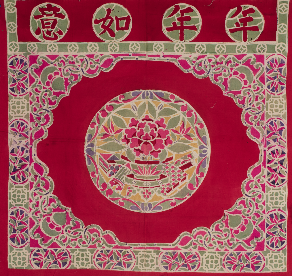 Colored table skirt decorated with four Chinese characters meaning "annual fulfillment" (